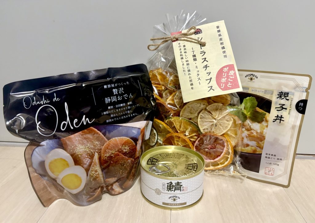静岡おでん、シトラスチップス、鯖缶、親子丼です。