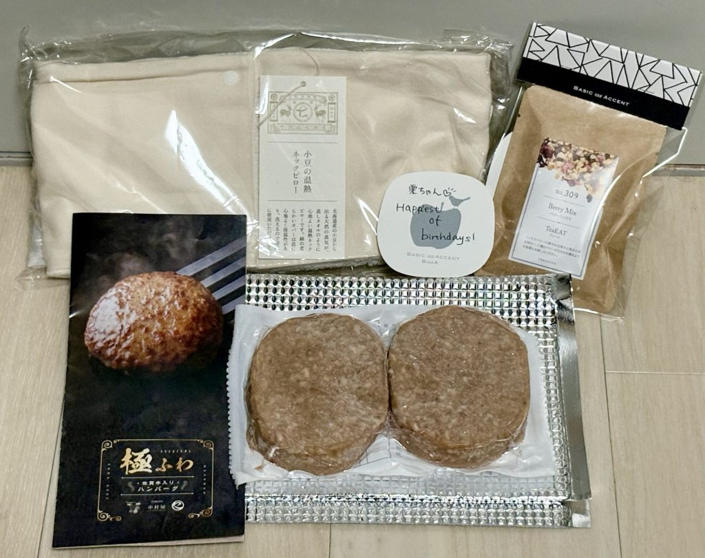小豆の温熱ネックピロー、フルーツティー、冷凍ハンバーグです。