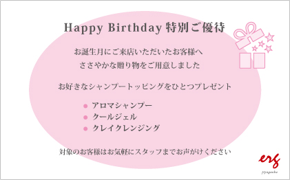 その大切な節目を当サロンでゆったりとお過ごしいただけるよう、誕生月にご来店いただいたお客様へ人気のシャンプートッピングをプレゼントいたします。